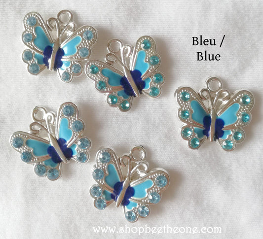 Breloque en émail Papillon argenté et strass assortis - 21 mm - trou 2 mm - 3 coloris disponibles