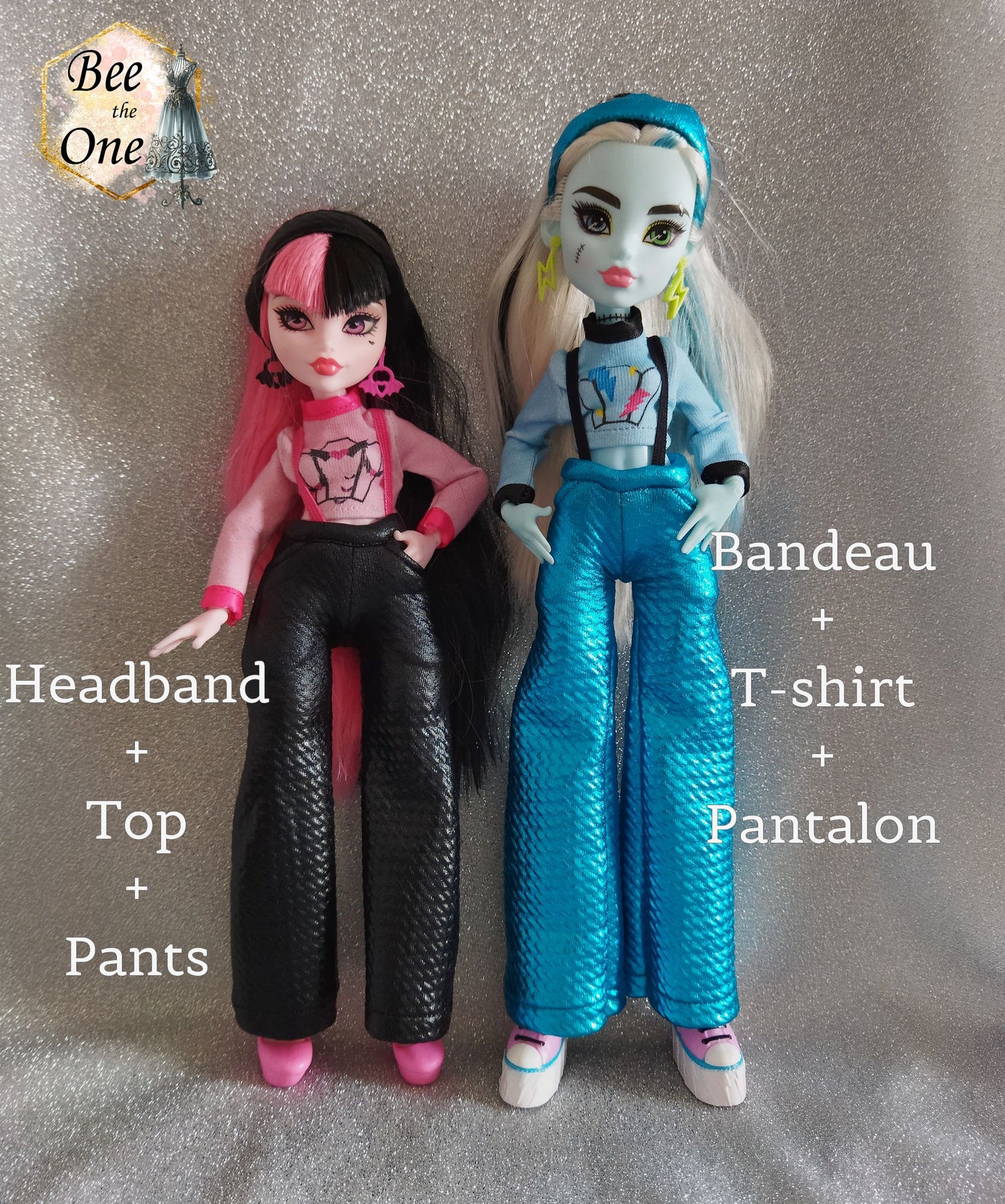 Frankie et Draculaura arborent un tout nouveau look brillant! Pantalon à poches et bretelles, bandeau brillant assorti et un superbe T-shirt à manches longues imprimé avec un motif exclusif!