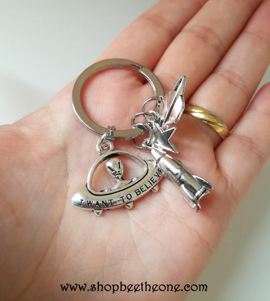 Porte-clés en métal breloque Alien "I want to believe" - Argenté